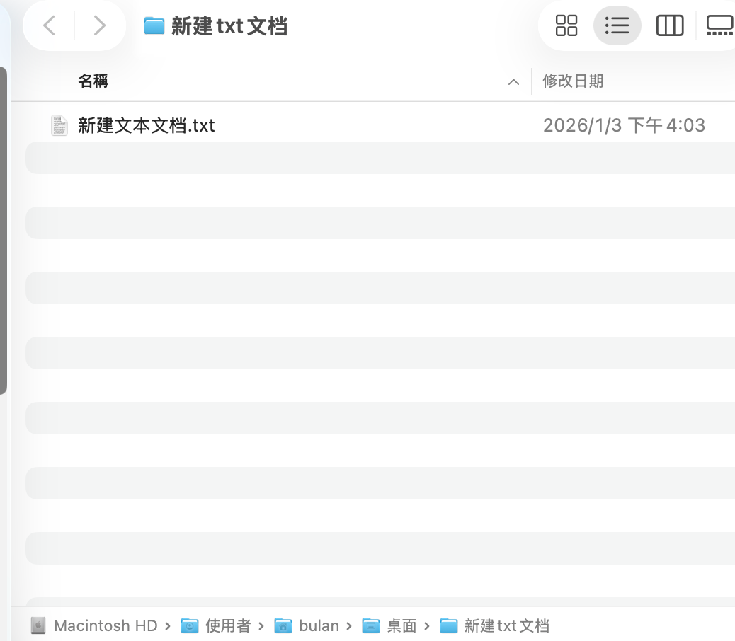 mac上新建一个txt文档如何像win那么简单 发表评论 / 冷门小技能, 文章, 电脑小常识 / 作者: xiaoji Automator 是 macOS 自带的,不用下载Finder → 应用程序找到 Automator 1️⃣ 点击 「新建文稿」2️⃣ 在类型列表里,选择 「快速操作」3️⃣ 点击 「选取」⚠️ 一定要选「快速操作」,不是应用程序 在新窗口顶部,你会看到两行下拉框:请设置成下面这样(完全一样):当前快速操作接收: 文件夹位于: Finder📌 这一步决定了你能不能在 Finder 右键空白处看到它 左侧操作区:1️⃣ 左侧搜索框输入:shell2️⃣ 把 「运行 Shell 脚本」👉 拖到右边的大空白区域 右侧会出现一个脚本框,把里面原有内容 全部删掉,然后 完整复制 下面这段进去:cd"$1" touch 新建文本文档.txt 确认下面两个选项:Shell:/bin/bash或/bin/zsh(哪个都行)传递输入:作为参数 1️⃣ 按 ⌘ + S2️⃣ 名称输入:新建txt3️⃣ 点击 存储自动文档,文档存储在这里,路径~/Library/Services/ 立刻测试(关键)现在请你这样做:进入任意文件夹(比如「桌面新建一个文件夹」)在文件夹上右键选择:快速操作 → 新建 TXT 👉 看看该文件夹中是否立刻出现新建文本文档.txt 阅读量 152 分享到: 点击分享到 Facebook (在新窗口中打开) Facebook 点击以分享到 X(在新窗口中打开) X 赞过:赞 正在加载……